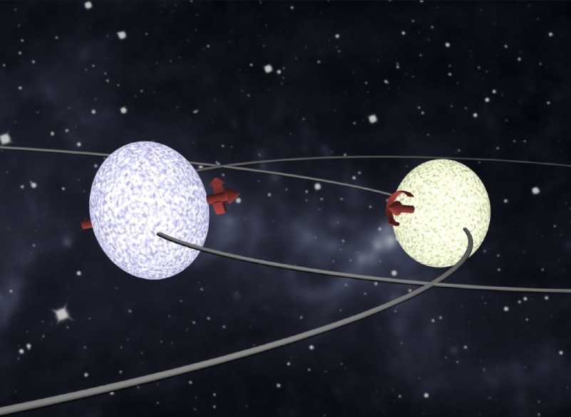"De oorzaak is dat beide sterren zeer ver uit het lood staan, en zelf met hun draaingsas bijna onder een haakse hoek ten opzichte van het baanvlak staan", zegt Simon Albrecht, de Leidse oud-promovendus die sinds kort met een prestigieuze NWO Rubicon fellowship aan het Massachusetts Institute of Technology (MIT) werkt. "Door de snelle rotatie van de sterren zijn deze afgeplat in een richting vrijwel loodrecht op het baanvlak. Deze bizarre configuratie zorgt ervoor dat het relativistische effect wordt tegengewerkt", aldus Albrecht. "Alhoewel het oude raadsel hiermee de wereld is uitgeholpen, zitten we wel met een nieuw probleem", zegt medeonderzoeker Ignas Snellen.