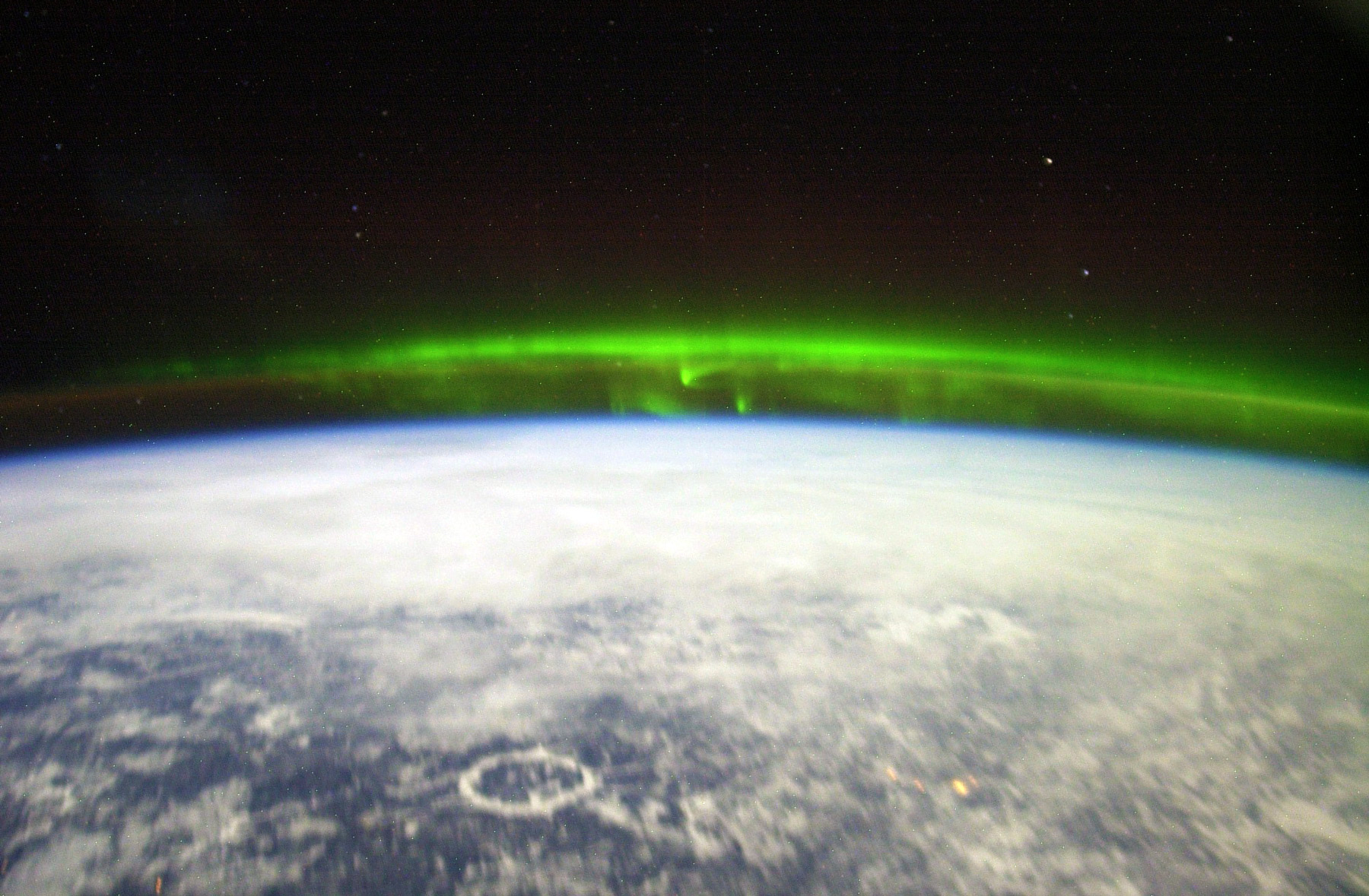 Toch vormen de stromen van electronen en protonen geen direct gevaar voor ISS. In 2003 legde de ISS Wetenschappelijk Officier Don Pettit een groene aurora vast, hieronder te zien in een digitaal scherper gemaakte afbeelding. Vanuit een baan rond de Aarde rapporteerde Pettit dat de veranderende poollichten wel rond leken te kruipen als reusachtige groene amoeben.