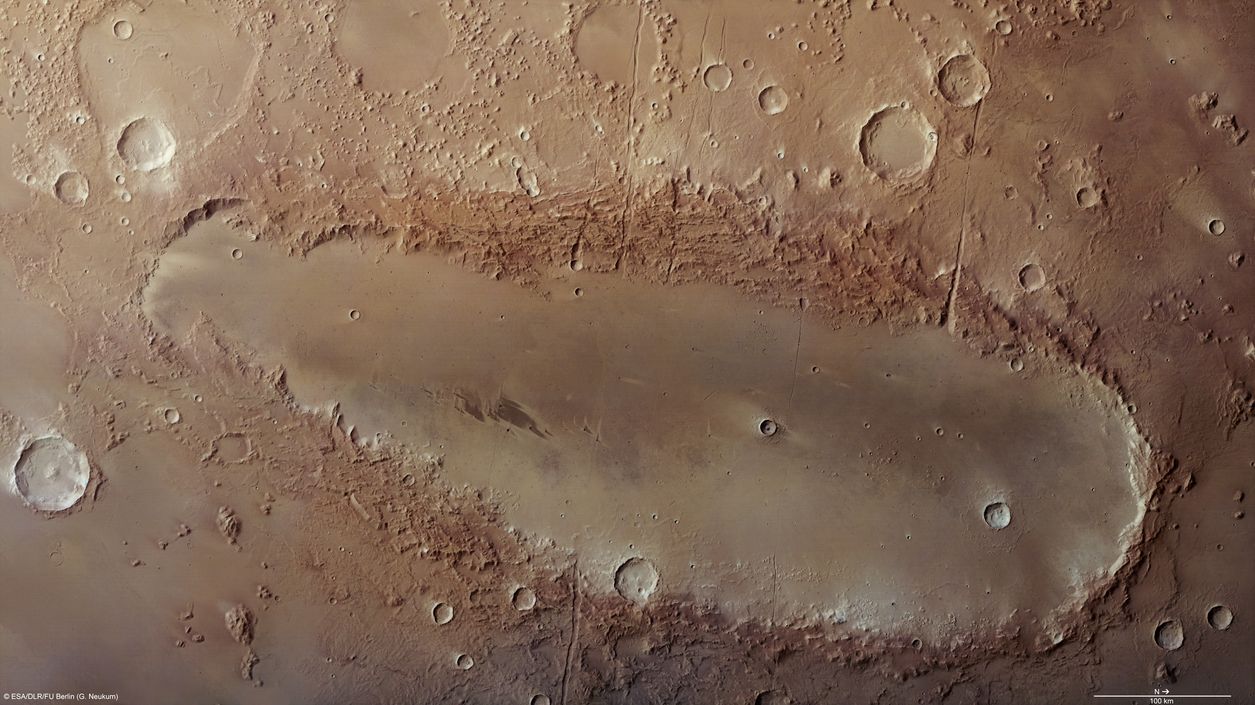 Nieuwe beelden van een oude krater op Mars lijken een enorme 'voetafdruk' te tonen. De foto's met hoge resolutie maken wetenschappers echter niet veel wijzer over het eeuwenoude mysterie van de Orcus Patera, zoals de krater officieel heet. Integendeel. Mars-experten worden door de beelden van ESA nog meer in verwarring gebracht.